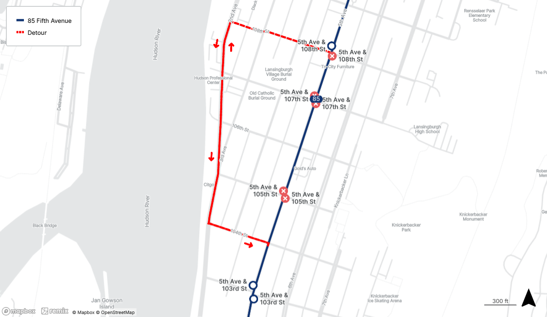 Wednesday, April 29, 2026 Status General Advisory Route(s): 85 Northbound Detour due to Other cause Affected Stop(s): 04324, 04374, 04376 Route: 85 North Direction: North Bound Reason: Structure Fire Reroute: Left 104th St, Right 2nd Ave, Right 108th St, Left 5th Ave Duration: Until farther notice Bus Stop Closed: 04374, 04324, 04376