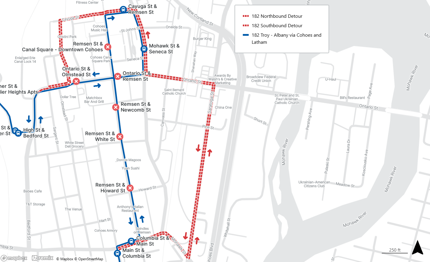 Reroute: Ontario St. to left Olmstead St. (Across from Dollar Tree) to right Cayuga St. to right Mohawk St. to left Ontario. to right Saratoga St. to right Mohawk St. continue over tracks to Columbia St.
