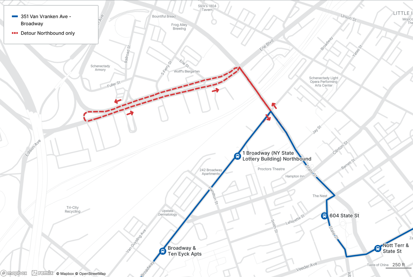 Tuesday, February 10, 2026 through Friday, February 13, 2026 Status General Advisory Route(s): 351 Northbound Detour due to Construction ROUTE INFORMATION/DURATION Route: 351 Direction: Northbound only Reason: Construction on State at Broadway Reroute: Left on State St., Left on Erie Blvd., Left through roundabout, Right on State St. Duration: Until further notice Bus Stop Closed: None