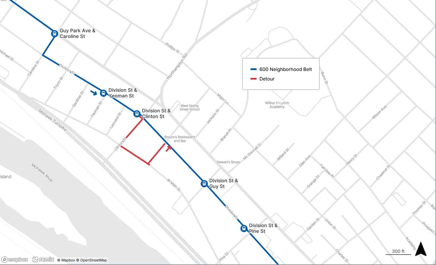 Reroute: From Division St; Right Clinton St,; Left West Main St.; Left Bayard St.; Right Division