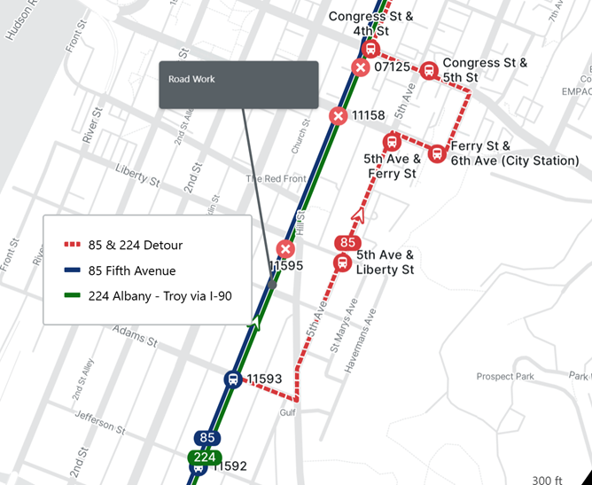 Monday, November 17, 2025 Status General Advisory Route(s): 85, 224 Northbound Detour due to Construction Affected Stop(s): 07125, 11158, 11593, 11595 Route: 85 & 224 Direction: Northbound Only Reason: Construction Reroute: Right Adams, Left Hill St, Bear Right to 5th Ave. Right Ferry St. Left Congress , Right 4th St Duration: Until further notice Bus Stop(s) Closed: 11593, 11595, 11158, 07125