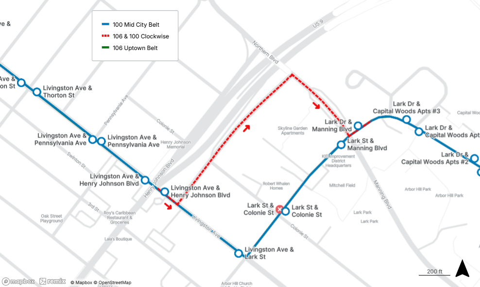 Thursday, April 23, 2026 Status General Advisory Route(s): 100, 106 Inbound Detour due to Construction Affected Stop(s): 00664, 11709 Route: 106 & 100 Direction: Clockwise Reason: Roadwork Lark Dr & Colonie Street Reroute: Left-Northern Blvd, Right-Manning Blvd, Left-Lark Drive Bus Stop Closed: 00664, 11709