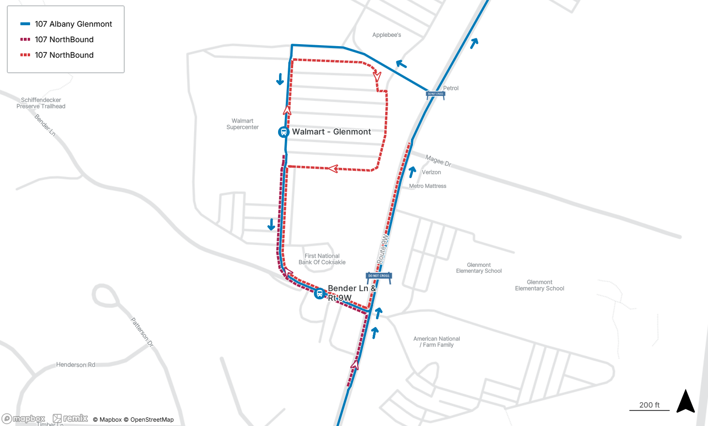 Monday, April 27, 2026 through Tuesday, April 28, 2026 Status General Advisory Route(s): 107 Northbound Detour due to Accident Route: 107 Direction: Northbound Reason: Road Blockage at Walmart Reroute: Left to Bender Lane , Service Walmart, Then Circulate the Parking Lot, Left to Bender Lane, Left to Regular Route Duration: Until Completed Bus Stop Closed: None