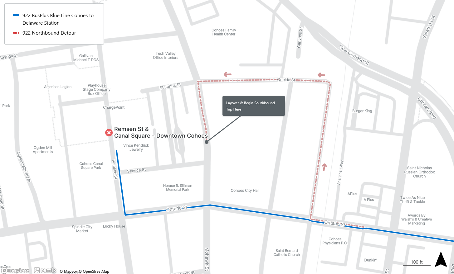Reroute: Ontario St. to left Olmstead St. (Across from Dollar Tree) to right Cayuga St. to right Mohawk St. to left Ontario. to right Saratoga St. to right Mohawk St. continue over tracks to Columbia St.
